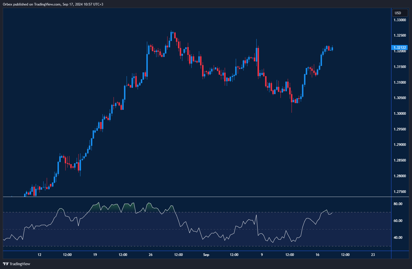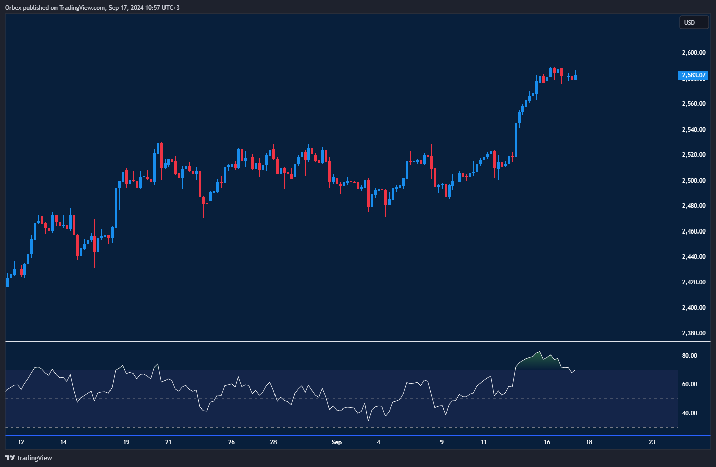 Gold pulls back slightly from hitting another record as bulls await the Fed’s interest rate decision. A close above the former daily support of 2560 has prompted some sellers to cover their positions, foreshadowing a potential bounce in the making. A brief slide has found support at 2575, and a higher high indicated mounting pressure. 2600 is the next threshold, and 2540 is the first support in case of a fallback as the RSI is overbought again.