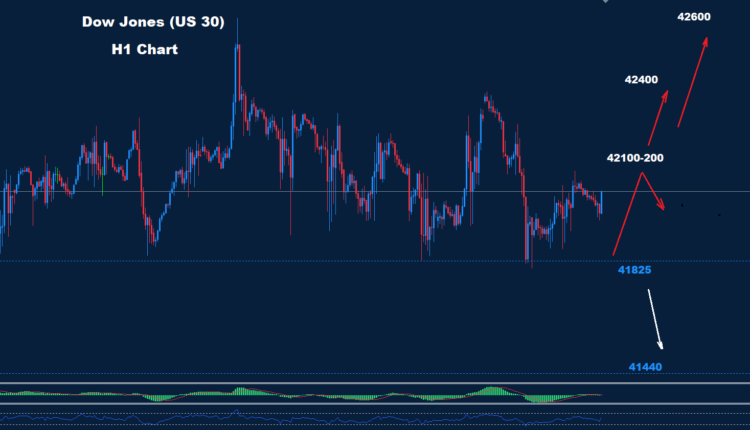 The Dow has maintained trades above the main support level of 41825 while rebounding toward the resistance zone of 42100-200.