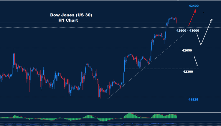 The market managed so far to sustain trades above the second support of 42650 which could keep the advance wave ongoing toward 43400.