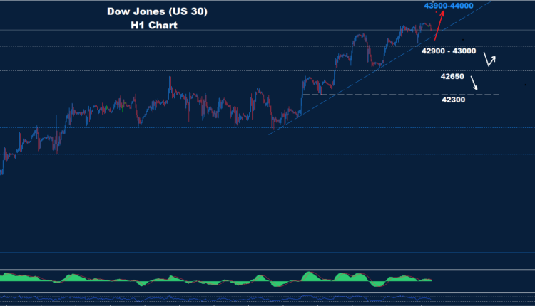 As we see over the Intraday chart, prices face the first Intraday support around 43140. If prices remain above 42900-43000, the advance wave could sustain toward the 43900-44000 zone.