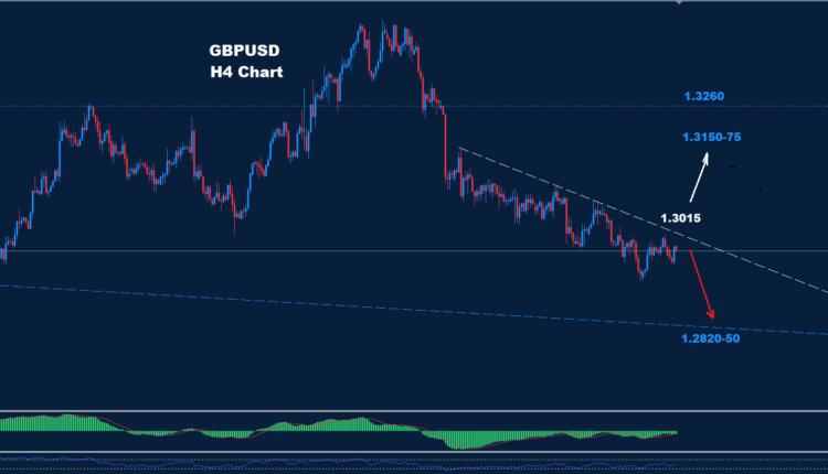 As we see on the chart, prices face a downtrend resistance around 1.3015. If prices remain below it, then the downtrend pressure could sustain toward the 1.2820-50 zone.