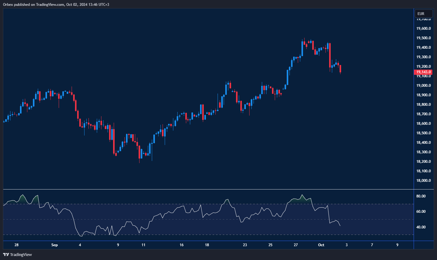 The Dax dropped off its recent top as euro indices fell. The latest move from 19400 indicates a new round of sell-offs. A break below 19000 would force several bulls to close out, stirring up volatility as they scramble for the exit. The level of 18800 could be the last stop before a further drop would take shape, with 18350 as an intermediate target. The former resistance of 19400 is the target to the upside as the RSI went oversold.