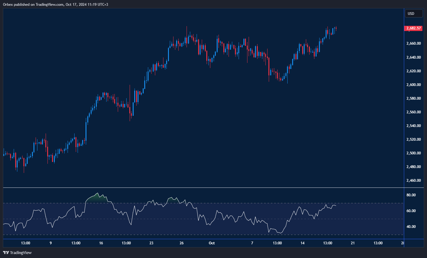 Gold traded higher for a third day in a row as buyers pushed price action towards a fresh peak. The price is testing 2680 at the previous top with 2700 in sight. 2640 at the base of the latest bounce was a vital level to sustain the bullish thrust, as its break would have forced buyers to abandon ship. The level of 2600 is vital to maintaining the rally, and its breach could trigger a drop towards 2560.