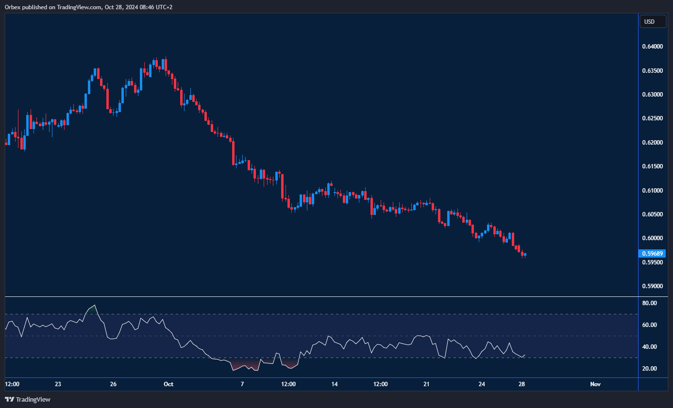 The NZD (Kiwi) is another currency that is feeling the wrath of the greenback. A series of lower lows indicates stiff selling pressure overhead. Successive breaks below 0.6160 then 0.6000 shows a lack of follow-through bids, putting the latest buyers on the defensive. A drop below 0.5900 could extend losses to last July’s low of 0.5850. On the upside, bears would hope for a rebound towards 0.6000 as the RSI grinds the oversold area.