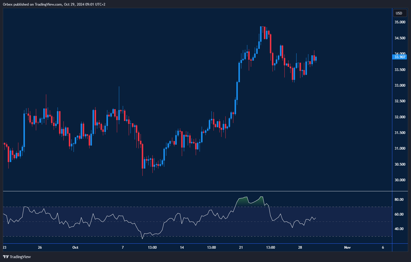 Silver steadied after a pullback from its recent high, which saw the metal attempt to reclaim the 34.00 level. As the precious metal bounced away from the 33.00 region, the RSI’s neutral condition on the chart might give the sell side a respite, causing more of a bounce as the opposite side takes some chips off the table. Most bulls could still be sitting and waiting for signs of stabilisation. 33.00 becomes the latest support, and only a rise above 34.50 would ease the mood and prompt more sellers to exit.