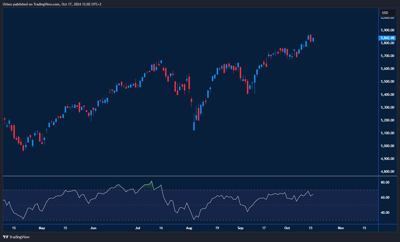 The S&P500 reached another record high amid optimism over a strong earnings season report and another rally in tech stocks. With the Fed expected to maintain its hawkish approach to rate cutting, equities in general seem unfazed. As the index powers towards 6000 for the first time, any chance of a pullback would see 5700 as the first support. Corporate earnings will be a significant guide on just how far the S&P can go in the next month.