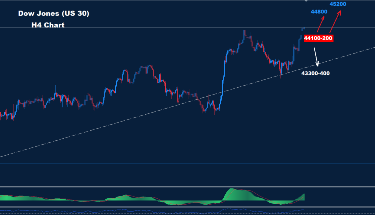 As we see on the chart, prices face a new support zone around 44100-200, where as long as the market holds above it, the advance wave could expand toward 45200.