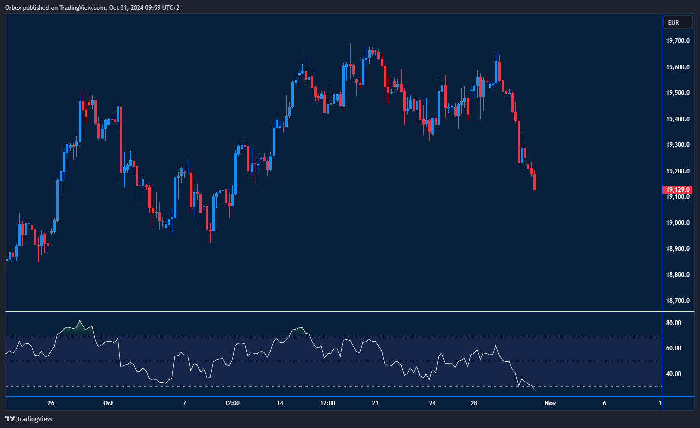 The Ger 40 (Dax) struggles as the sell-off from last week rumbles on. The index is still trying to hold onto 19000, as a drop below this critical chart level could shift sentiment to the pessimistic side and trigger a deeper correction to 18700. A former brief support at 19100 is the first obstacle to clear to ease the downward pressure. Only a rally above the major support-turned-resistance of 19450 from the daily chart could initiate a meaningful bounce.