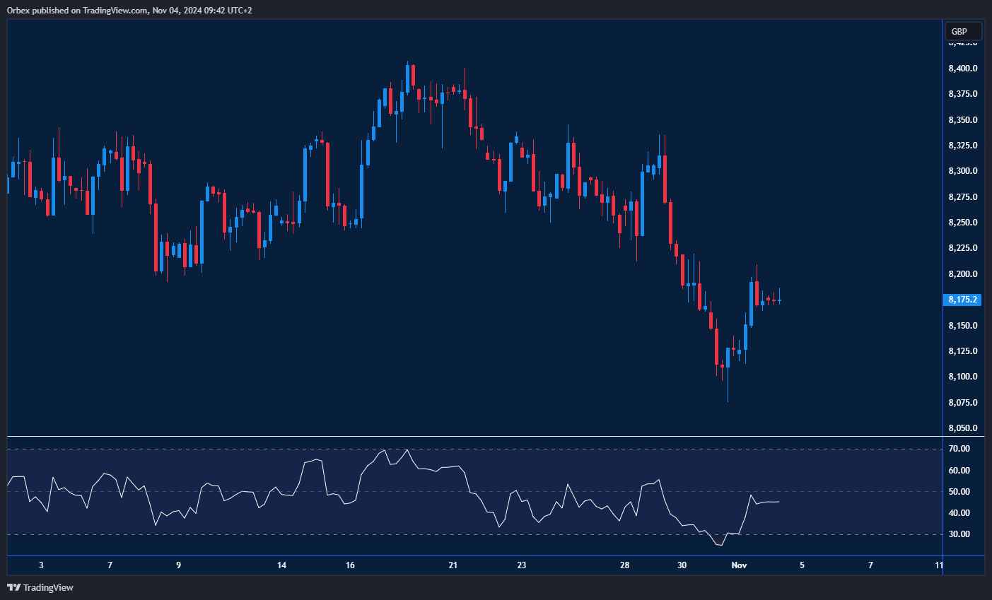 The FTSE is testing a turnaround as the index fell towards the 8000 zone. After jumping a few hundred points higher, a bullish breakout would put the remaining bears under pressure. A break above 8200 could lead to a potential bullish continuation above 8300. In the meantime, the RSI’s potential overbought condition could cause a retracement towards 8100 should intraday buyers start to take some chips off the table.