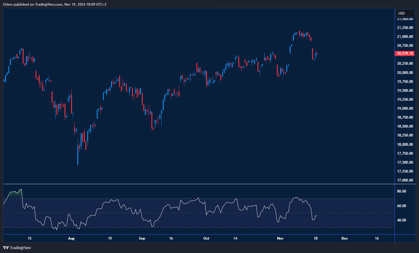 The Nasdaq snapped back after sliding from its record peak last week. A limited bounce has met some selling pressure at 20600, and a subsequent reversal below 20250 would suggest that the sellers are still in the market. From the daily chart’s perspective, this means that the index could be in for a prolonged correction with the psychological level of 20000 as a potential target. The RSI’s oversold situation could cause a brief bounce to 20700 should sellers take some chips off the table.