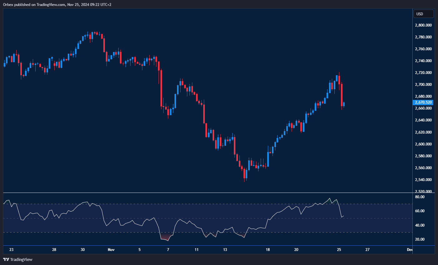 Gold found resistance after correcting as prices fell away from the recent peak at 2720. The price attempting to hold onto its previous gains after a rise from the trough at 2540. The daily RSI’s overbought condition might lead to a pullback to let the bulls take a breather before the next leg of the rally. 2640 is the immediate support, and a bounce above the psychological level of 2700 would signal a bullish continuation towards 2750.