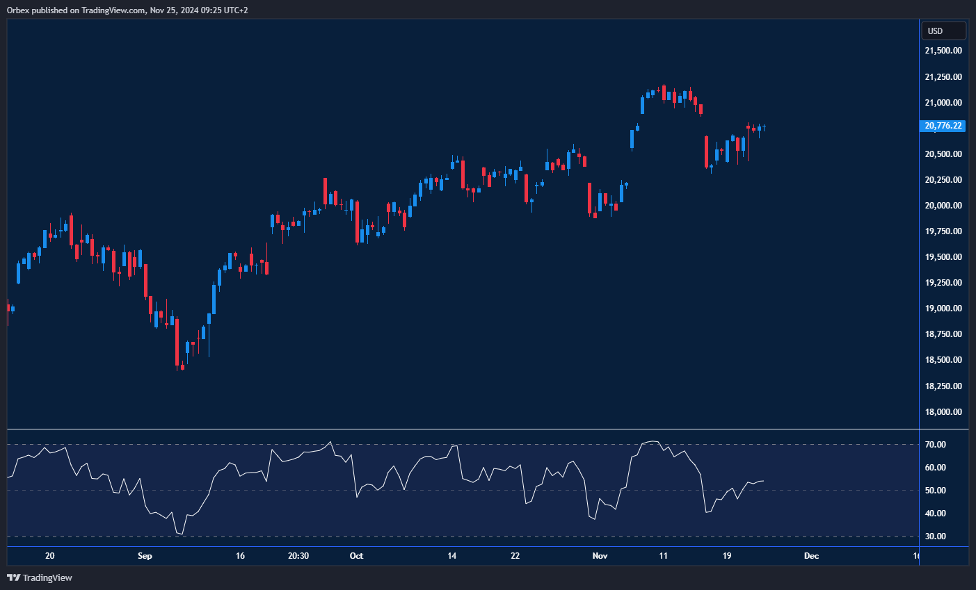 The Nasdaq100 index recouped some losses as traders bet the Fed might leave rates unchanged at their next meeting. The index is trying to claw back some of the previous losses, but sentiment is still cautious. The spike at 20800 is a key obstacle where a breakout could ease the selling pressure and pave the way for another record high. However, sellers could be looking to sell into strength as the RSI remains neutralised. 20250 at the base of the latest bullish thrust is the closest support in case of a retracement.