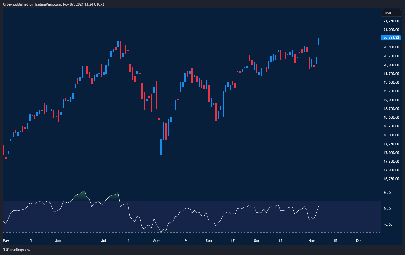 Indexes rallied last week, hitting record highs, as Donald Trump won the presidential election. Trump looks likely to support lower corporate tax rates, deregulation, all of which could provide more stimulus to the American economy. As per his previous four years in office, all three major indexes are expected to continue moving higher under his tenure, even if the Fed changes their plans for more dovish rate cuts. 21000 is a crucial ceiling to clear, and 20400 is a fresh support.