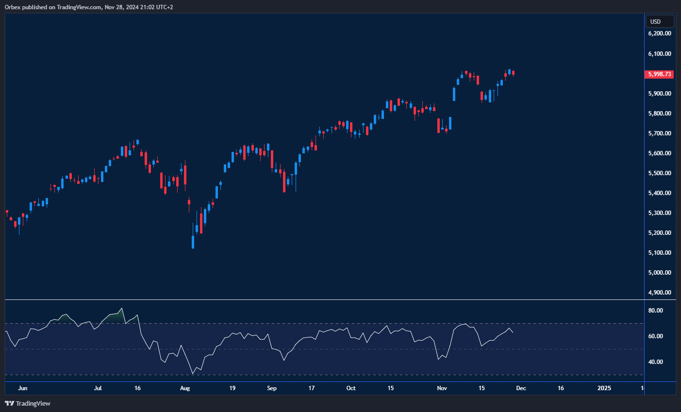 US indices were in a buoyant mood after rallying in recent sessions. The sticking point for the S&P looks to be the 6000 level, which it has failed to make a clean break above it. With stocks still looking bullish after last week’s holiday, it will be up to progressive bullish sentiment to move the S&P higher as we move into the final month of the year. 6080 is the first hurdle to clear, and 5800 is a crucial support.