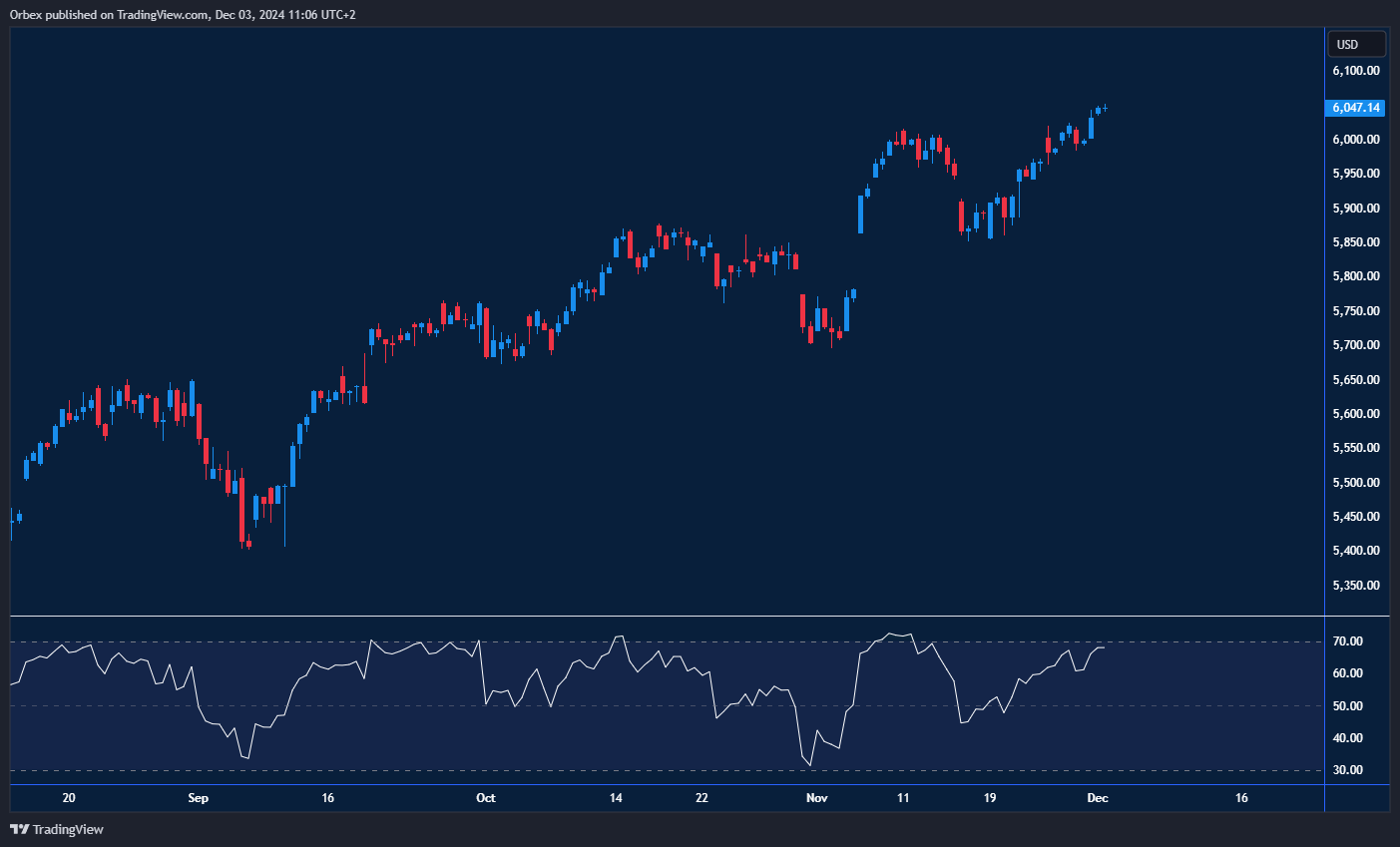 The SPX 500 stock rode a solid day for tech stocks to record another closing high. On the chart, the index is testing the latest high of 6040. A bearish RSI divergence could indicate a loss of momentum, which could be a combination of fresh selling and profit-taking in this congestion area. 6000, then 2850 are the following two layers in case of a correction. However, a bullish breakout would force sellers to scramble for the exit and open the door to an extended rally towards 6100.