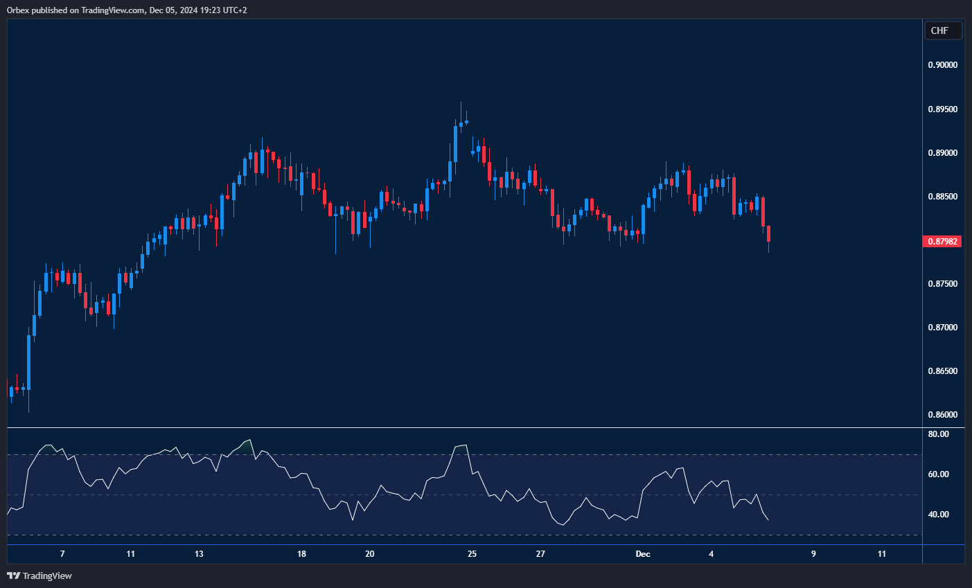 The US dollar holds steady as traders brace for the latest NFP numbers. On the chart, the price is holding steady above the recent support at 0.8790. A break below would send the pair into a downward spiral, with 0.8700 as the next bearish target. On the upside, 0.8870 is the nearest resistance, and its breach would expose 0.8950, bringing the greenback close to a bullish continuation at the recent peak.
