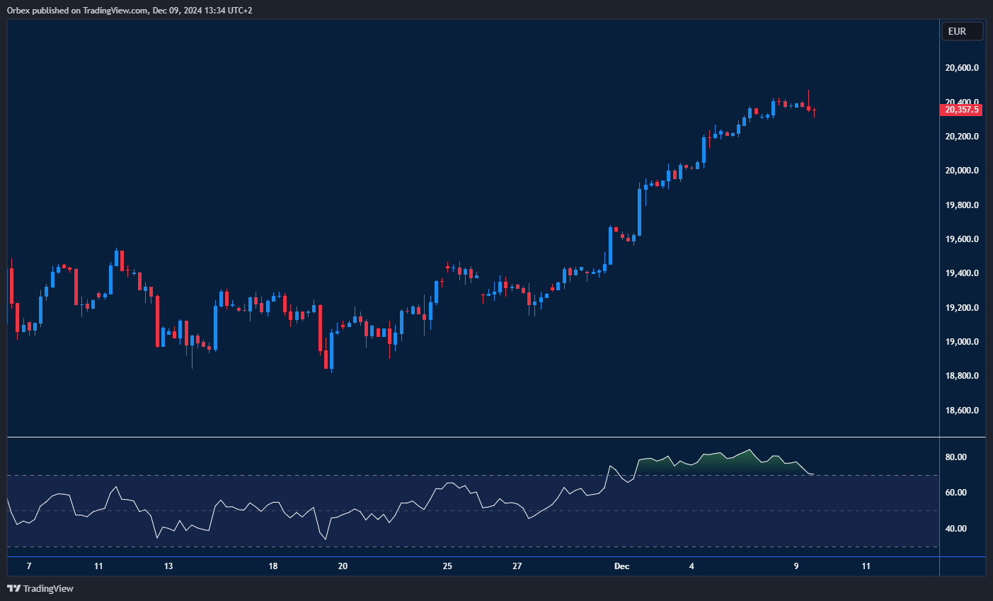 Germany’s stock index faded slightly from its record high as the Dax looks to hit another peak. The Germany’s stock index made a decisive break above 20000 putting buyers back in the game with a solid footing. The previous swing high of 20400 is the next resistance standing in the way of a bullish continuation in the medium term. As the RSI drops, a limited retreat might be needed to let the bulls regroup in anticipation of a new round of rallies. The former supply zone 20200 has turned into a support.
