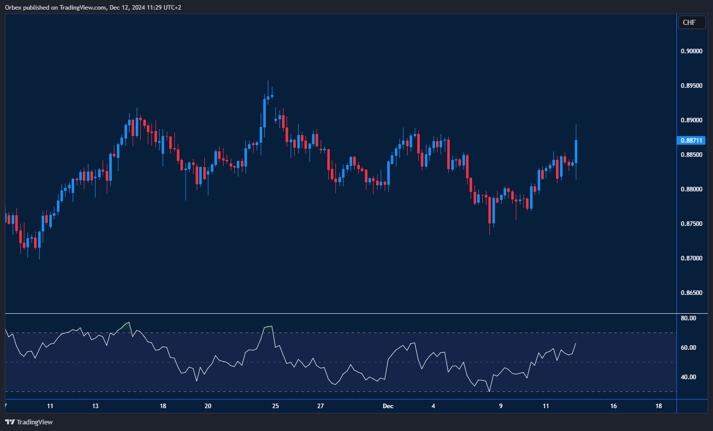 The US dollar (USD) slipped as CPI data crept higher, which could cause the Fed a headache at their next meeting. A move above the daily resistance of 0.8850 kept the bullish momentum going, putting sellers under renewed pressure. A brief consolidation has now lifted offers towards 0.8900 and 0.8950 at the previous swing high, which is the next level to see whether the bulls will stay in the game. On the downside, the level of 0.8800 at the latest bounce is a firm support to hold on to.