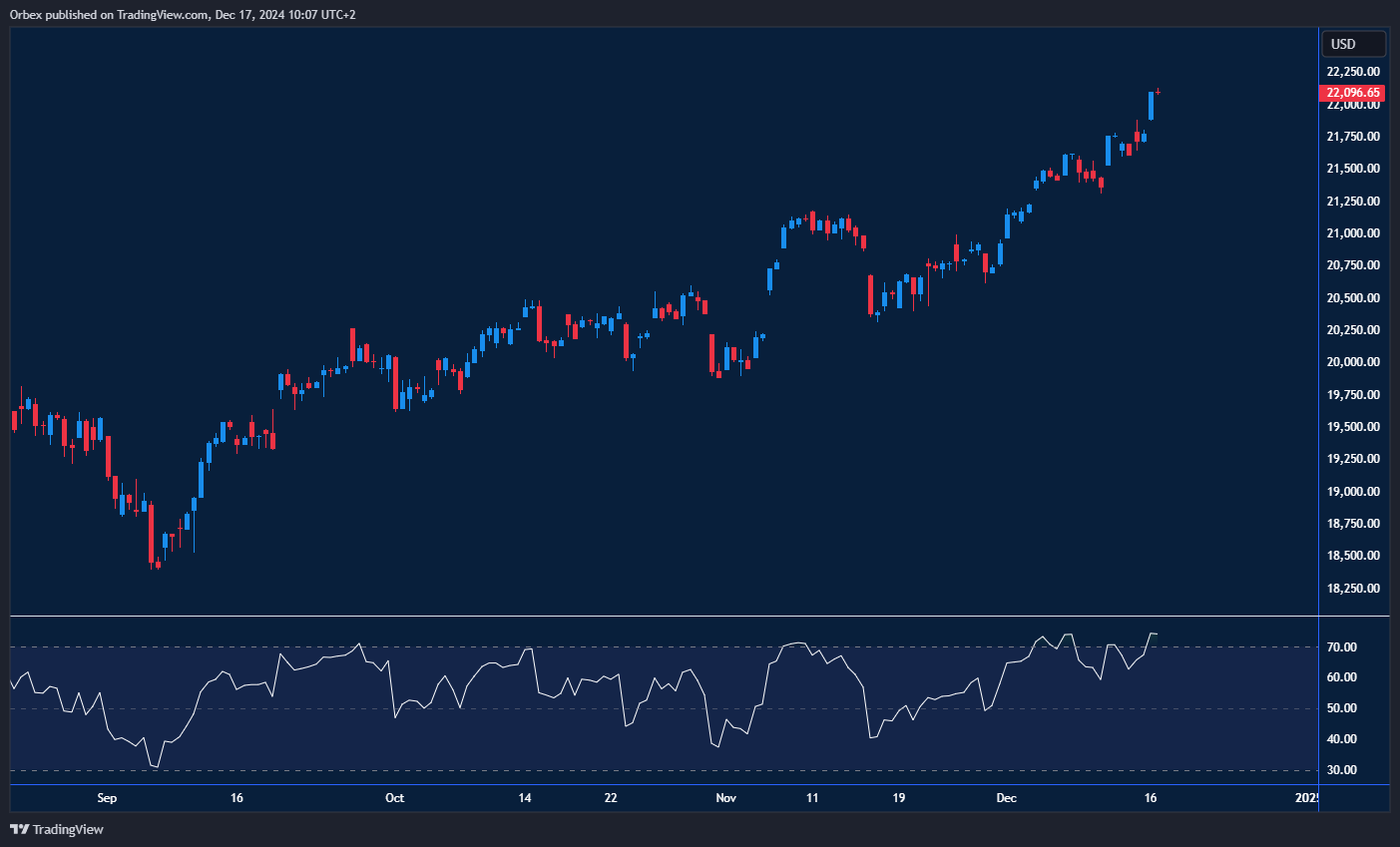 The Nasdaq (NAS 100) advances as investors continue to price in the Fed’s next move. The price continues on its way above this year’s high of 22000, further reinforcing the bullish mood. 22250 is the next target before the index continues the rally to the next all-time high. A pullback cannot be excluded to let the rally take a breather, especially as the RSI keeps showing an overbought condition. 21600 is the first support should this happen, and 21350 would be a second layer to expect follow-up buying.