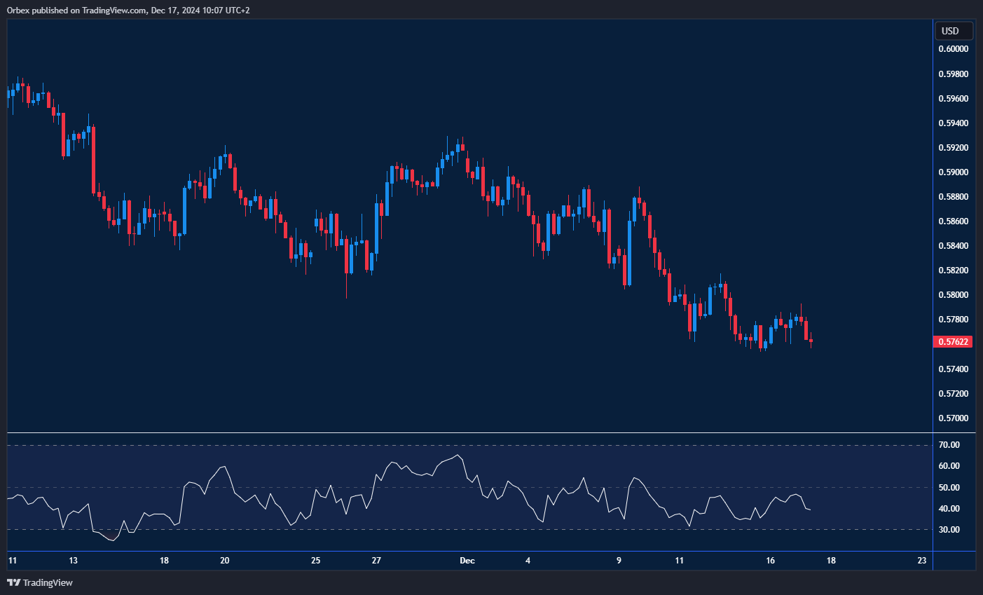 The New Zealand dollar remains pressured as the greenback continues to dominate. A jump below the daily support of 0.5800 has prompted buyers to cover their positions and eased the pressure in the short term. 0.5740 is the next hurdle for bears, and another move lower could be expected from a combination of profit-taking and fresh selling. A bullish breakout, however, would open the door to the early December peak of 0.5920 as the RSI flirts with the oversold area.