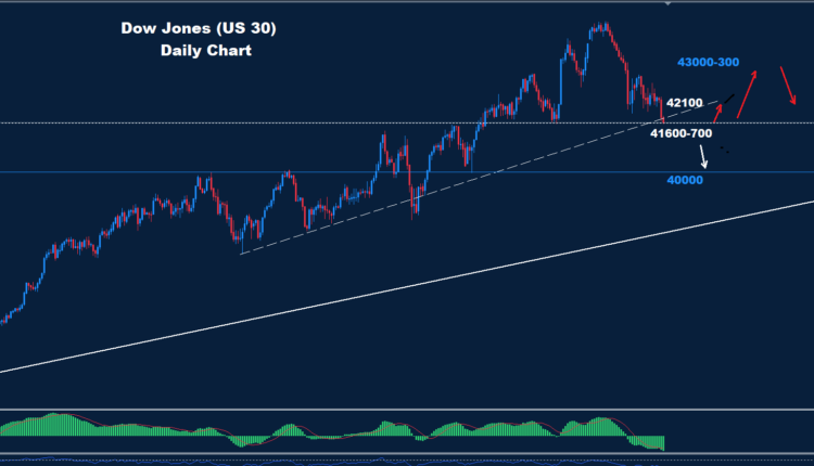 The Dow managed to hold trades above the support zone of 41600-700 and managed to rebound toward the first target of 42100 and above.
