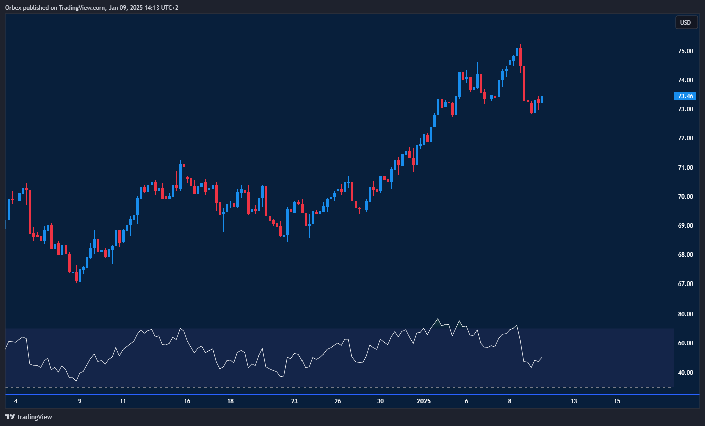 WTI crude slumped as traders worried that above-target inflation could undermine demand. After moving over $5 since the start of the year, the price hit resistance at 75.00. The invalidated rally was likely driven by profit-taking, and sentiment remains cautious at best. Sellers could look to double down, and a fall below 72.00 would put 70.00 at risk, whereas a breakout would open the door to a bearish reversal. The RSI’s oversold situation could attract some limited buying.