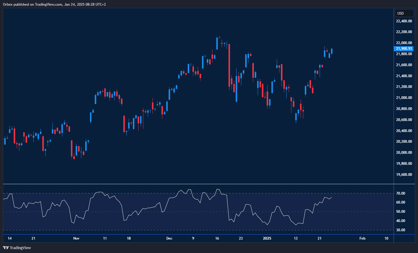 The Nasdaq 100 hit a fresh high as the tech stocks continue to rally. The index is capitalising on its break above 21000, attracting momentum buyers in this crowded trade. The psychological level of 22000 is the next threshold, and a convincing breakout could fuel the optimism. However, a bearish RSI divergence will reveal a deceleration in the underlying momentum, and a retreat cannot be excluded. 21500 is the closest support should the bulls start to take profit.