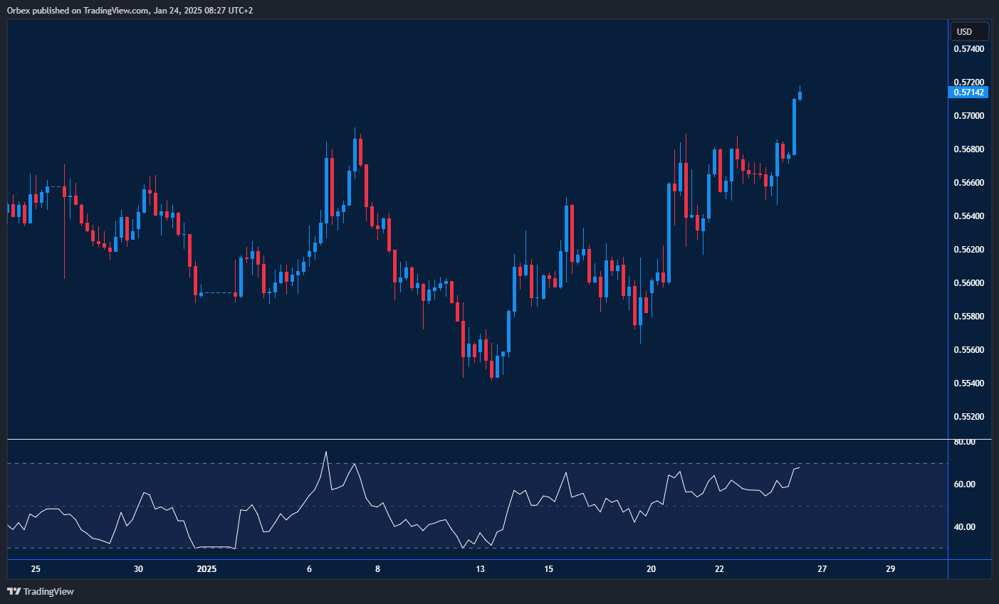 Like the Aussie, the New Zealand dollar gained further traction after breaking through the firm resistance of 0.5650. The rally accelerated after clearing offers around 0.5700, and a series of higher highs indicates ongoing interest in keeping the Kiwi’s edge. The mid-December peak of 0.5780 is a significant ceiling, and its breach would signal a continued bullish rally. In the near term, however, the RSI’s double top in the overbought area shows an overextension. 0.5650 is the first support, and 0.5580 is the bulls’ second layer of defence.