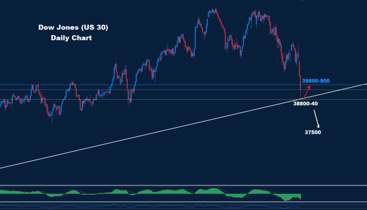 Dow is closing from short run support 38800 which may push for some rebound correction toward 39800-900 zone