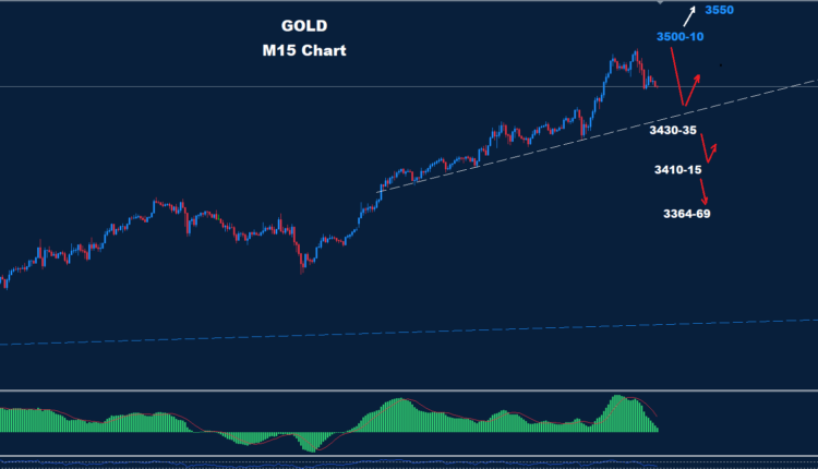 As we see over the chart, Gold faces a chance for a correction wave as long as the market holds below the resistance of 3500-10, where the support trend is around 3430-35.