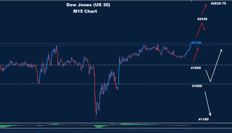 As we see over the chart the market is facing support around 41850 and 41600, which one of those supports could keep the advance wave going to break above 42100 and to head for a further advance with resistances at 42435 and 42875.