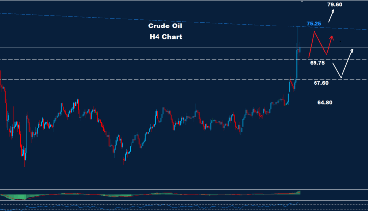 Above 75.25 the market could add more advance while traders need to be careful as in this situation, the Oil will be in the over bought zone which could push for fast correction.