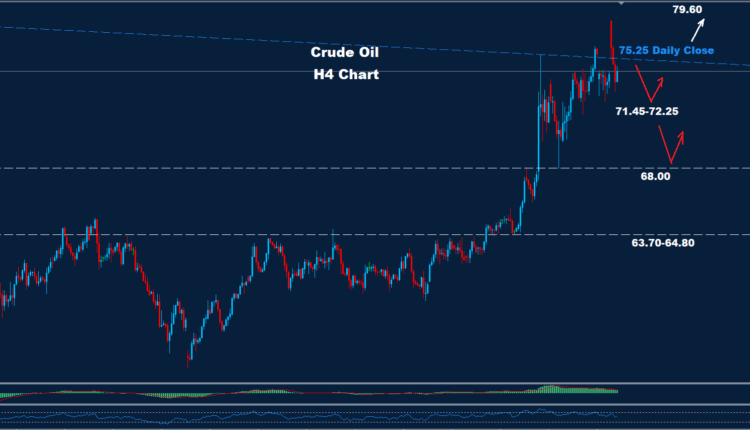 A daily close above 75.25 may activate another advance toward 79.60