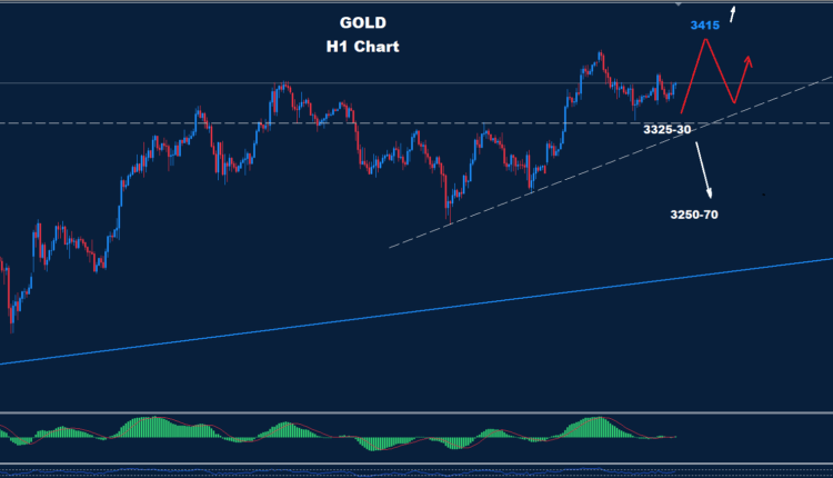 Gold found support yesterday around 3325-30 which could keep the advance wave going towards the 3415 resistance.