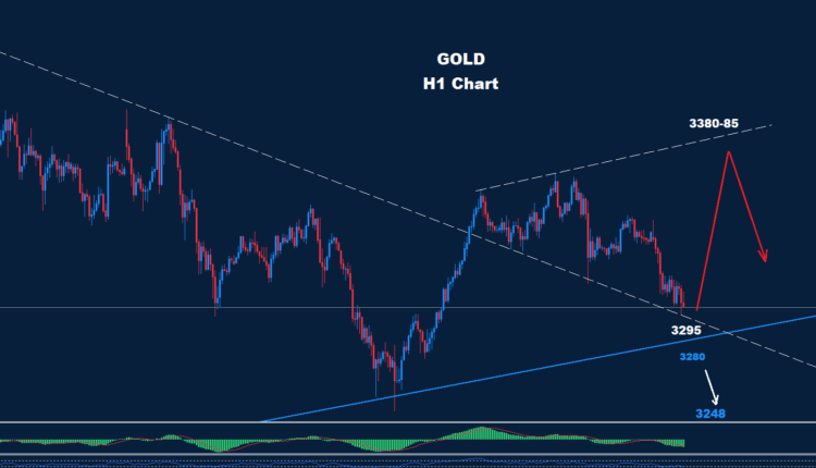 Gold managed to resume a drop at the market open today to test support zone of 3295-3305.