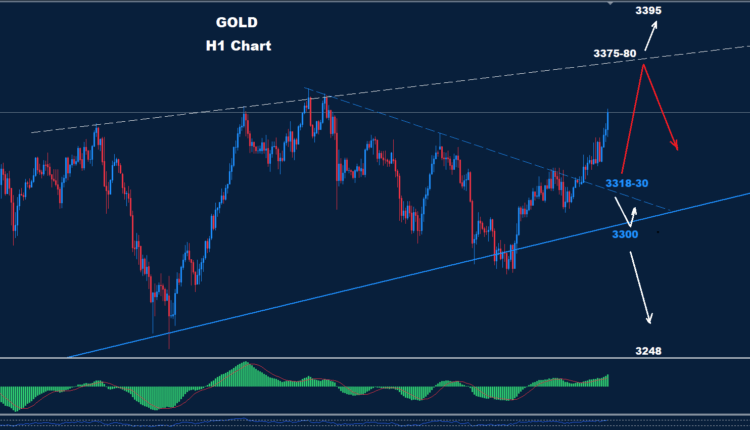 Gold managed to break above the Intraday resistance of 3330 which could push for an advance towards 3375-80.