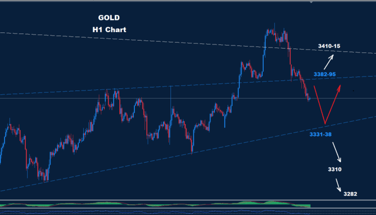 Gold dropped to close to the target and support zone of 3331-38.