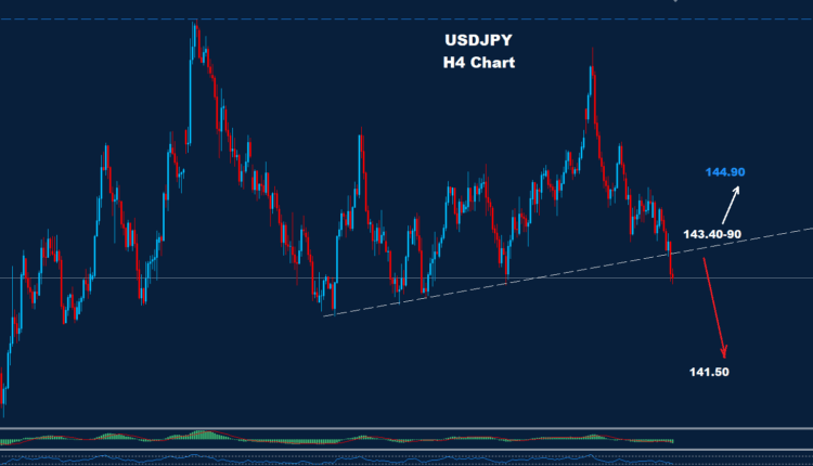 USDJPY managed to break below the support 143.30 which could push the market for a drop towards 141.50.