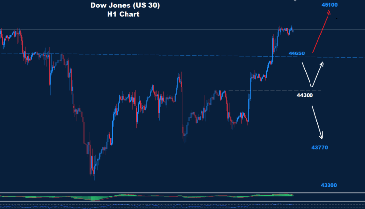 Dow managed to break above resistance 44700-50 yesterday which could push for a further advance toward 45100.
