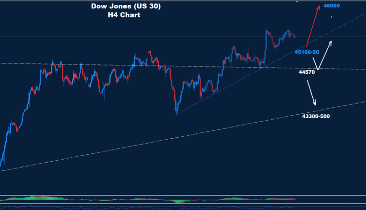 The Dow is still holding the advance wave as we see over the chart setting the first support around 45100-50.