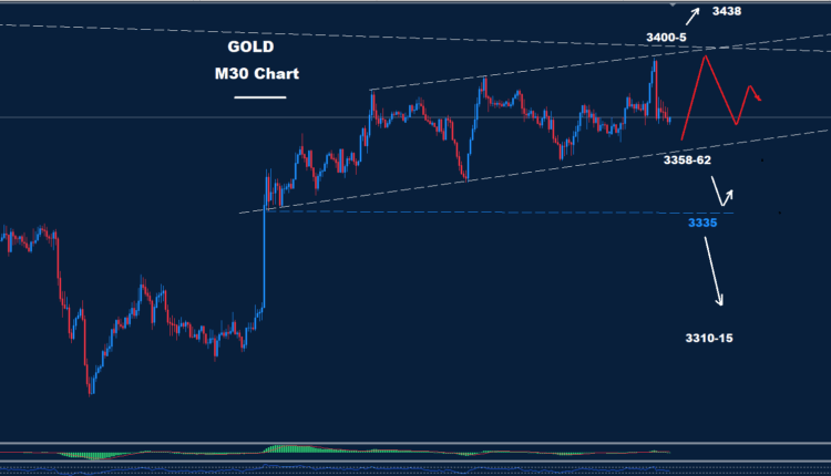 As we see over the Intraday chart, the market is facing an uptrend channel between support 3358-62 and resistance 3400-05.