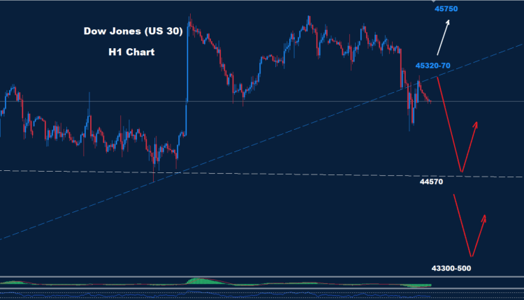 As we see from the Intraday chart, prices face a resistance zone around 45320-70, where as long as the market remains below it, a further drop will be expected. Support at 44570 could give a chance for a rebound towards the 44900-45000 zone.
