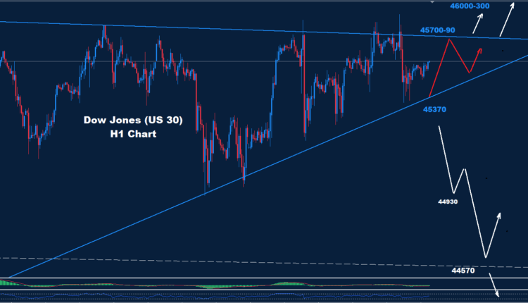 As we see over the Intraday chart, the market support is at 45370 whilst resistance is still at 45700-90 ahead of the US inflation report.