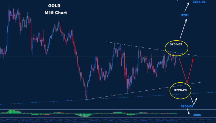 As we see over the Intraday chart, Gold seems to be building a trading zone inside a triangle formation, with a support zone at 3720-28 and a resistance zone at 3755-62.