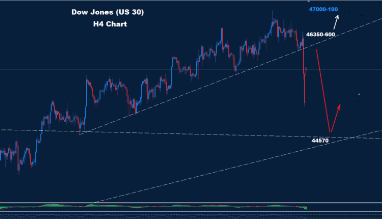The Dow fell below the support of 46100 last week and managed to accelerate the drop movement toward 45135 before prices rebounded on Trump’s announcement over China.