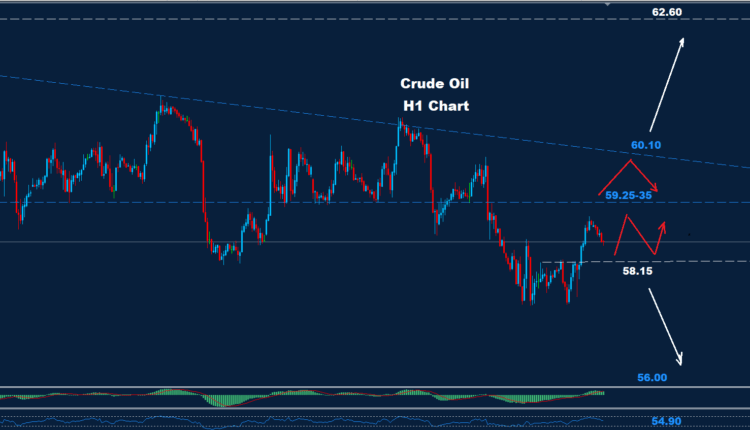 Crude Oil managed to pass above 58.40 which could begin a small trading zone between support 58.15 and resistance 59.25-35, which also could expand towards the trend resistance level at 60.10.