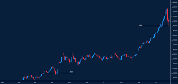 For every trader, there is always a psychological level to watch for, whether it’s on the upside or the downside. As soon as Gold broke the $3k level, the focus shifted to the next big target, $4k.
