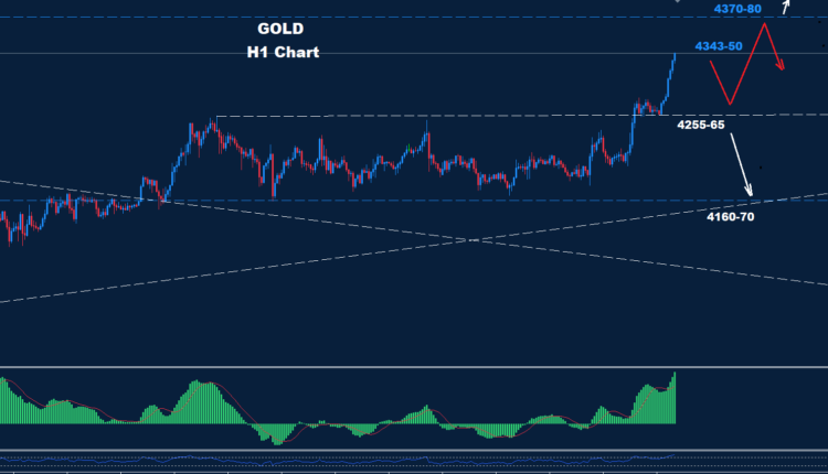 Gold dropped as prices trade inside the trading zone between support 4255-65 and resistance 4350-65.