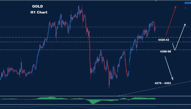 As we see over the chart, prices face supports at 4428-43 and 4388-98, where as long as the market holds above it, the advance could sustain towards 4520, 4550 and 4575.
