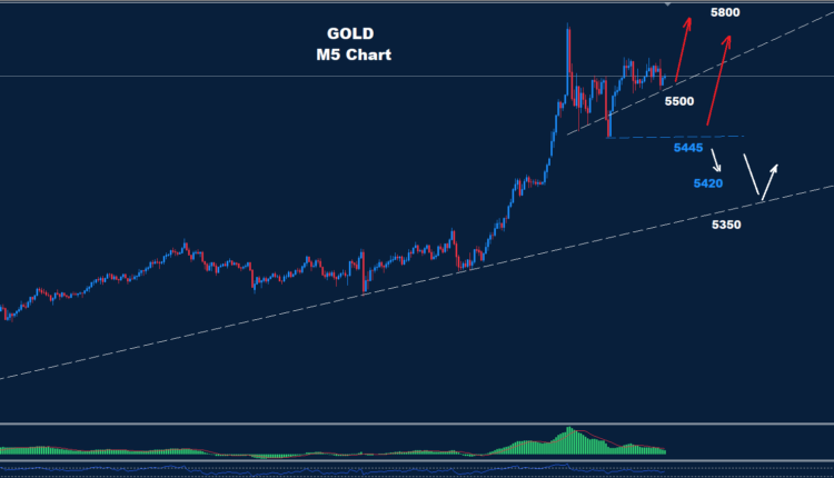 Gold managed to meet the first target at 5500 as prices look for the second target at 5800.